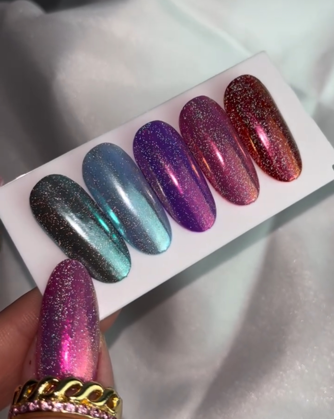 Des milliers de particules tridimensionnelles brillantes sont enfermées dans un vernis à ongles hybride.